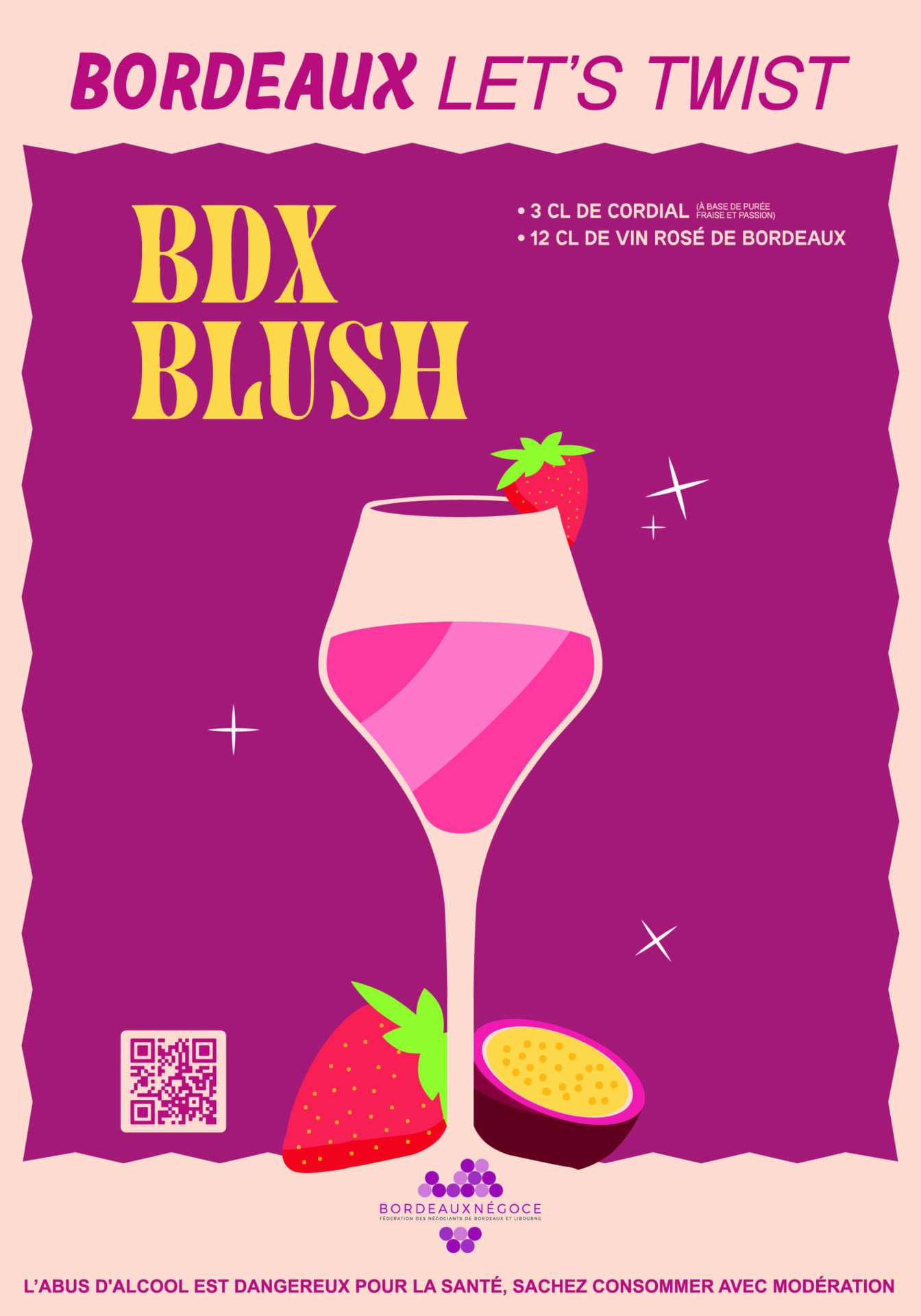 Versez 3cl de cordial fraise/passion puis le vin rosé dans un shaker rempli au 2/3 de glaçons. Secouez énergiquement. Versez le cocktail dans un verre à vin rafraîchi en filtrant les glaçons. Servez immédiatement décorez d’une fraise sur le bord du verre.