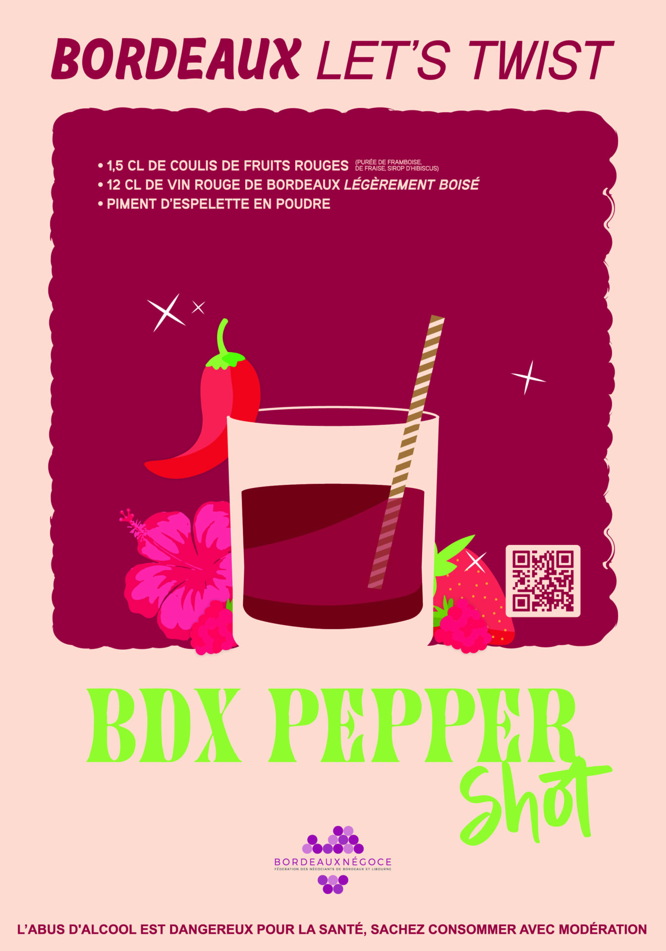 Préparez dans un verre mesureur votre coulis à base de 4 cl de fraise, 4cl de framboise, 4cl de sirop d’hibiscus, 1 cuillère à soupe de piment d’Espelette. Versez dans un shaker rempli au 2/3 de glaçons. Remuez énergiquement, filtrer votre coulis. Versez dans un verre à vin 1,5 cl du coulis, complétez par 12 cl de vin rouge de Bordeaux, servez frais avec une framboise sur le bord du verre.